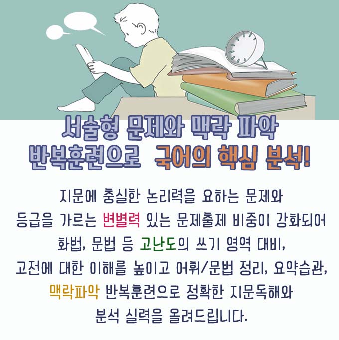 수능은 지문이 길고 문제 유형도 다양하다. 유형별 빠르게 정답고르는 요령을 익히되 올바르게 답을 유추하는 것이 중요하다. 오답을 정리하여 자주 틀리는 유형 차악하고 집중적으로 학습할 것.